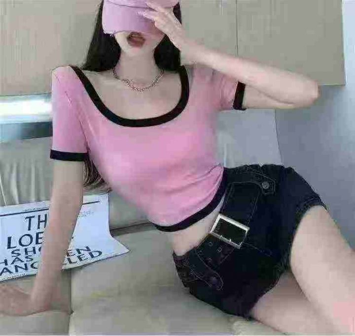 ① 辣妹风纯欲短袖t小众修身显瘦上衣!高弹力!独立包装均码!面料舒适柔软...