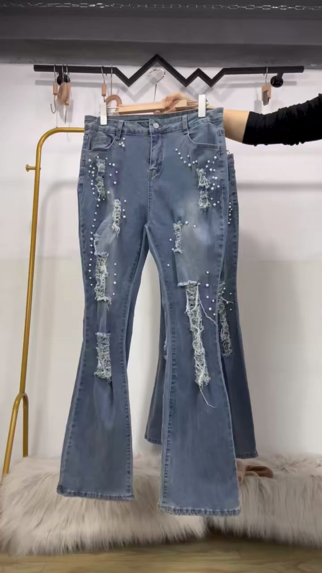 #Jeans wholesale女式高腰 重工艺钉珠装饰破洞高弹力修身显瘦时尚喇叭牛仔...