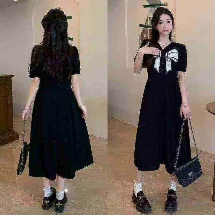 春季新款法式赫本风黑色蝴蝶结设计感小众气质收腰显瘦连衣裙,独立包装带吊...