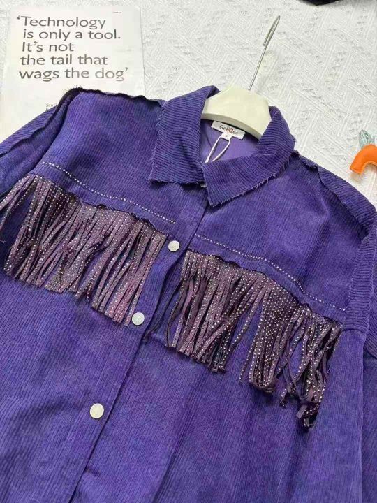142件秋冬新款休闲紫色铆钉流苏翻领灯芯绒外套,宽松...