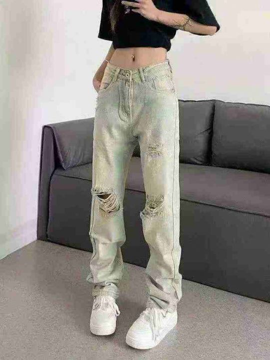 春秋新款高弹力洗水棉网红复古黄泥色牛仔直筒裤,独立...