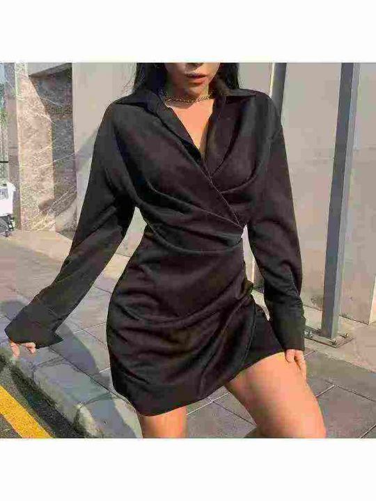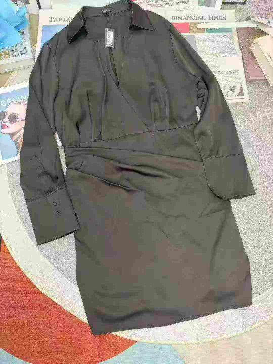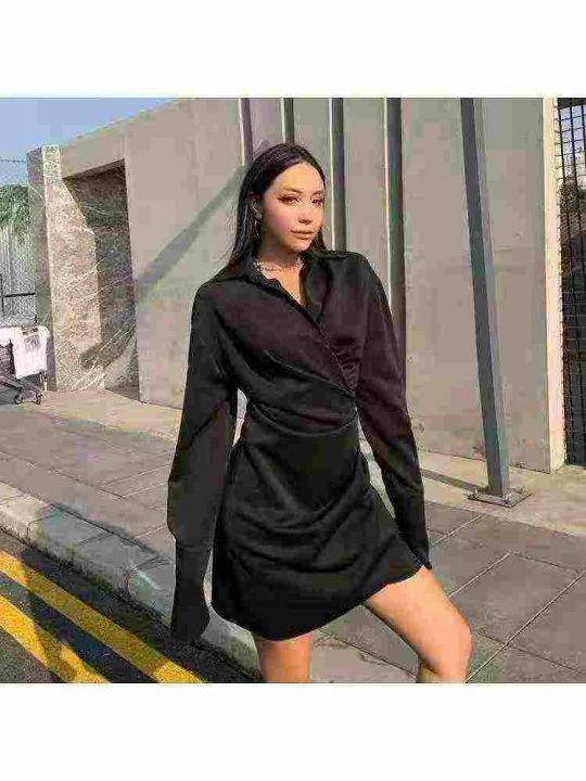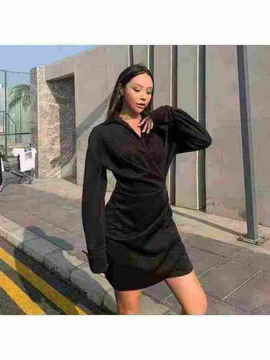 欧美性感长袖不规则褶皱显瘦气质黑色连衣裙,单款单色...