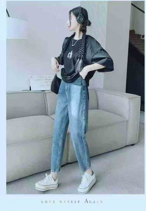网店下架新款高品质洗水高腰宽松显瘦牛仔老爹哈伦裤,...