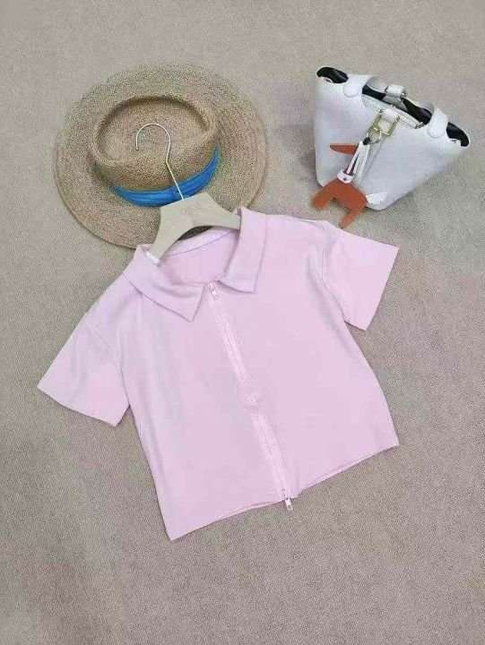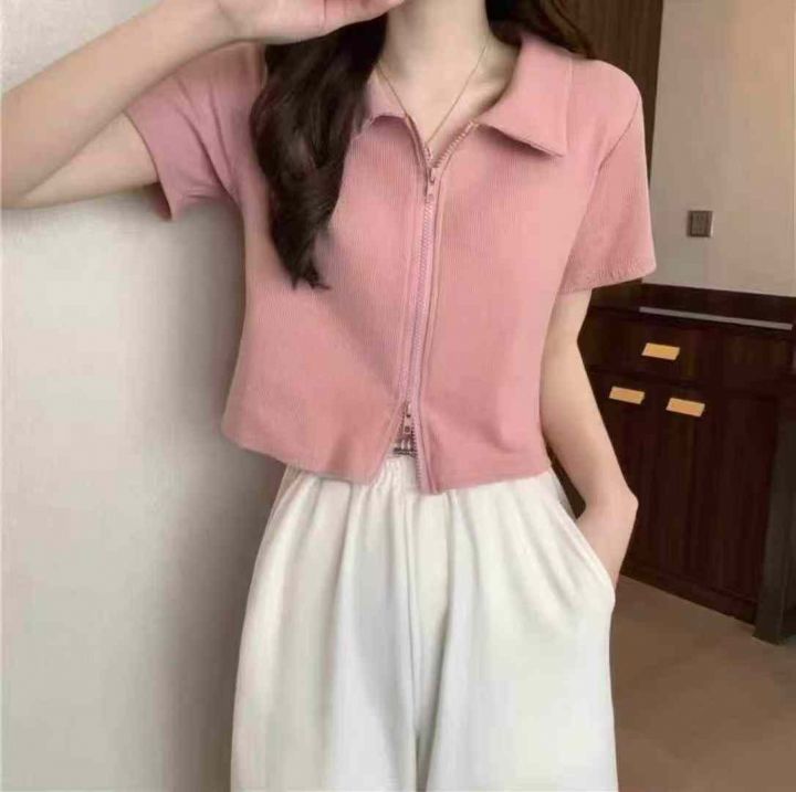 [月亮]:粉色Polo领双拉链短袖辣妹棉质上衣