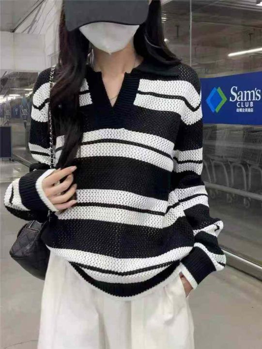 明星同款韩版宽松百搭撞色镂空套头polo领条纹毛衣,独立包装,均码宽松大版...