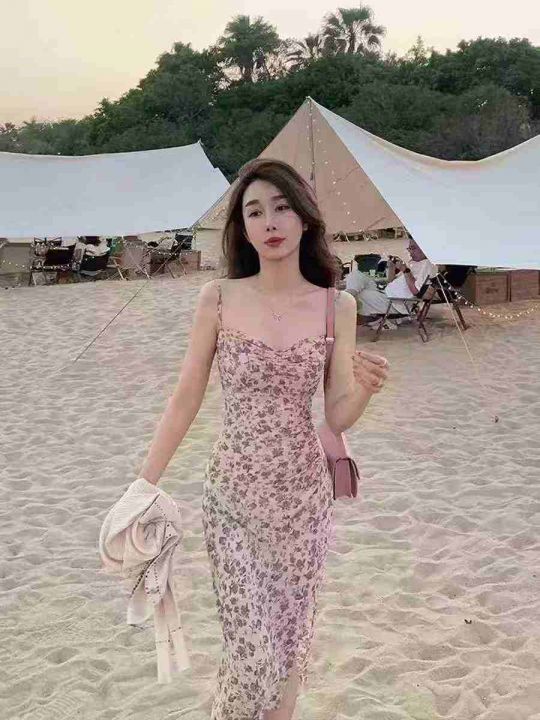 温柔风紫色碎花连衣裙女收腰显瘦小个子吊带裙,模特供...