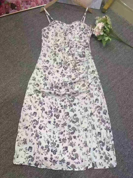 温柔风紫色碎花连衣裙女收腰显瘦小个子吊带裙,模特供参考,整款2色,1到4码,2码裙长105,独立包装,货品干净,570左右,7.8清,分货加1