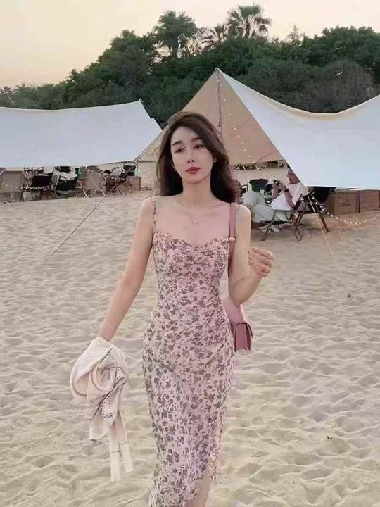 温柔风紫色碎花连衣裙女收腰显瘦小个子吊带裙,模特供...