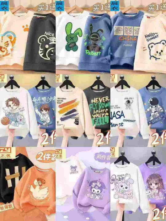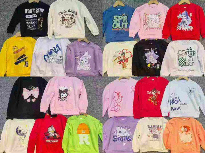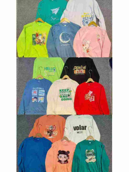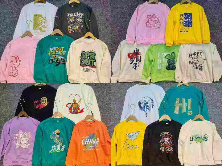 1700件春秋季男女中大童彩色多巴胺 印花圆领卫衣 鱼鳞棉布,杂图杂色 后领包边过肩,码数110-170 货品干净防水袋装。