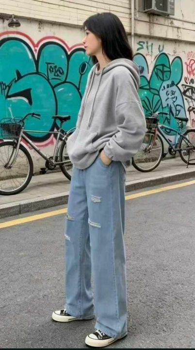 春夏季新款品牌原单宽松半松紧腰破洞设计款直筒阔腿牛仔裤,独立包装带吊牌...