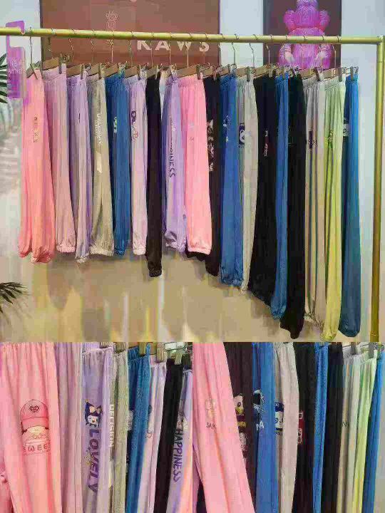 580件男女中大童薄款夏季休闲彩色防蚊裤束脚长裤,冰丝螺纹面料 高弹力,很多图案,码数110-170 货品干净防水袋装。