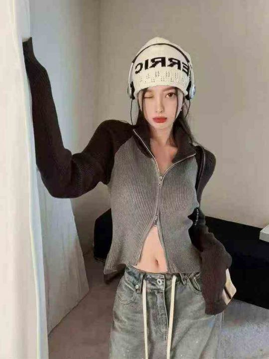 春季新款撞色插肩双头拉链辣妹设计感弹力修身针织毛衣开衫,独立包装,均码...