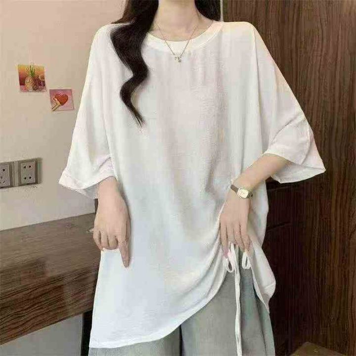 网红开衩不规则中长款中袖抽绳防晒衣t恤女夏洋气时髦防晒上衣潮,数量500左...
