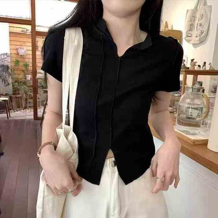328件复古ins夏季正肩短袖t恤女修身显瘦辣妹短款法式别致开叉V领上衣,面料...