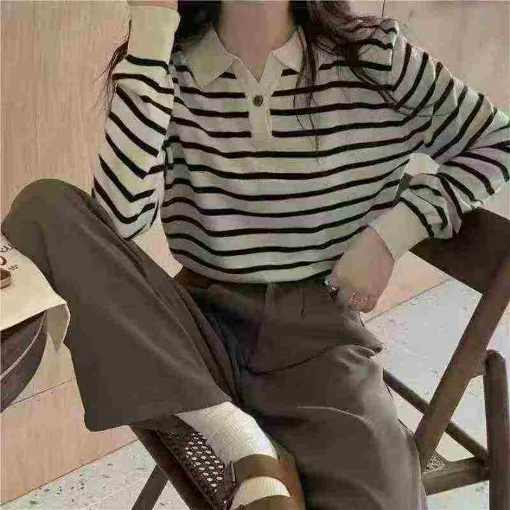 1200件早秋新款韩系宽松高级感撞色条纹百搭POLO领长袖针织毛衣,独立包装,均码面料柔软舒适,宽松款,全清6.5分+1。 货号:24862