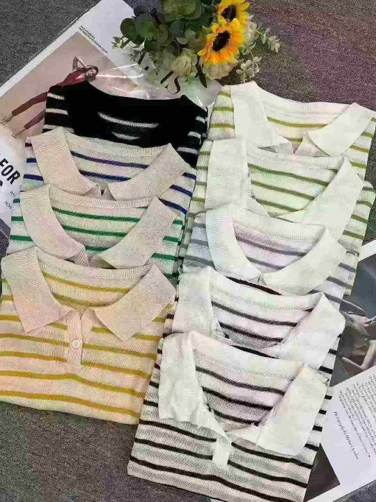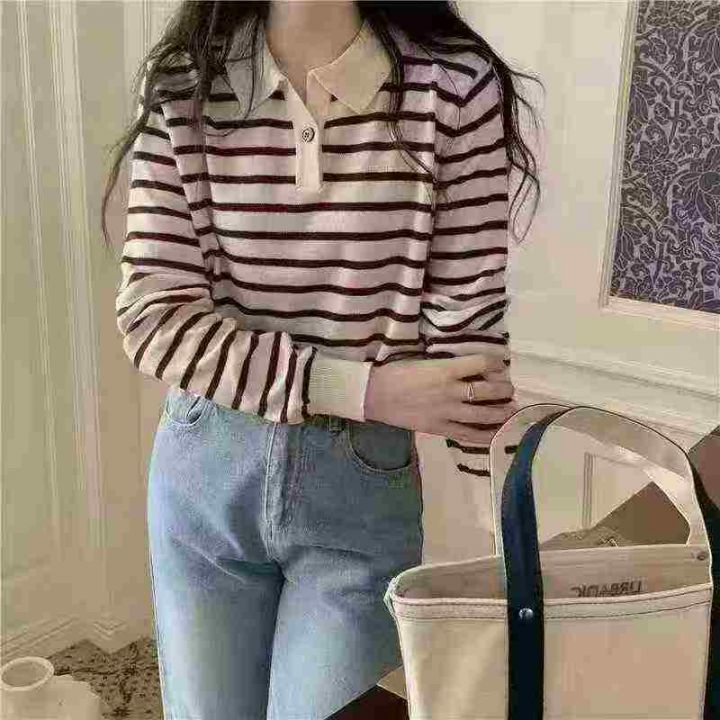 1200件早秋新款韩系宽松高级感撞色条纹百搭POLO领长袖...
