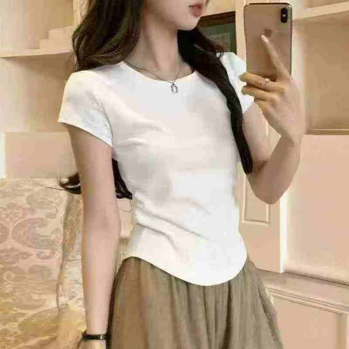 新款不规则短袖复古气质圆领修身弧形下摆螺纹T恤女,...