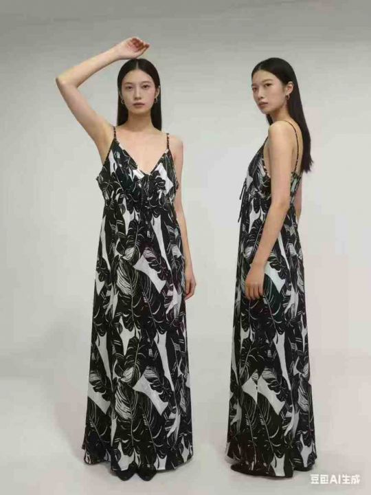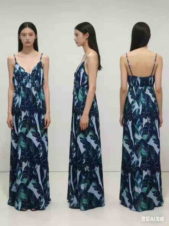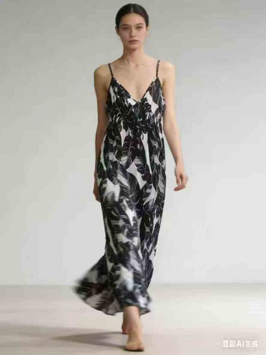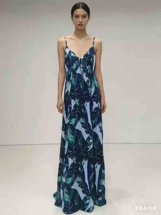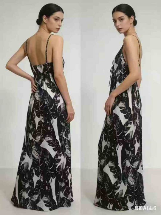 2025夏季欧美女装新款亚马逊度假长裙印花吊带露背v领...
