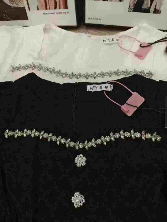 法式菱格镶钻方领高腰修身高级时尚连衣裙 数量112件 码数M--4XL 整款两个色 独立包装带吊牌 货品整洁质佳