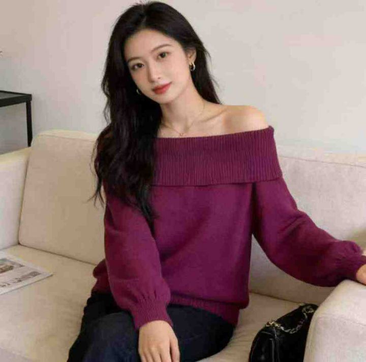 秋冬新款欧洲站欧货一字领露肩纯色高级感纯欲宽松慵懒...