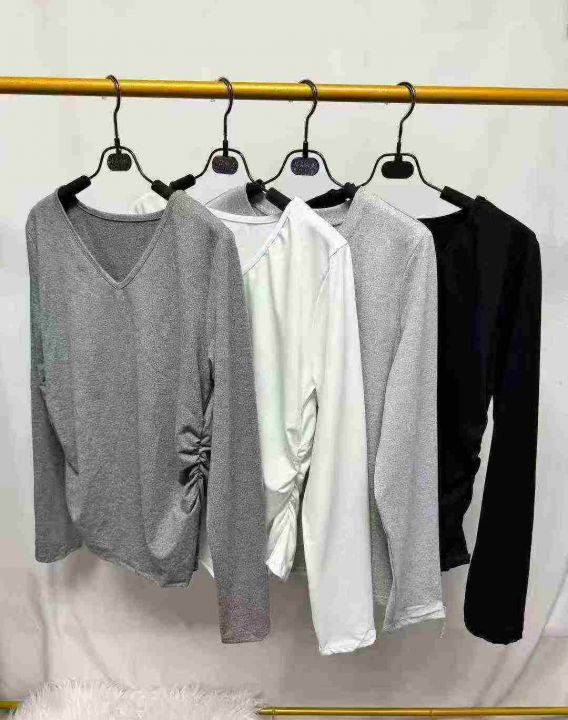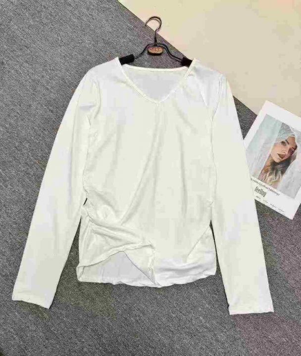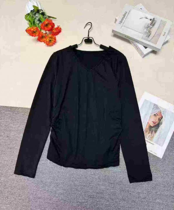 春季新款纯色V领/圆领长袖打底衫T恤女时尚简约褶皱收腰设计感上衣 ,数量 658 件,图片款,品质好,有包装。全清 3.8