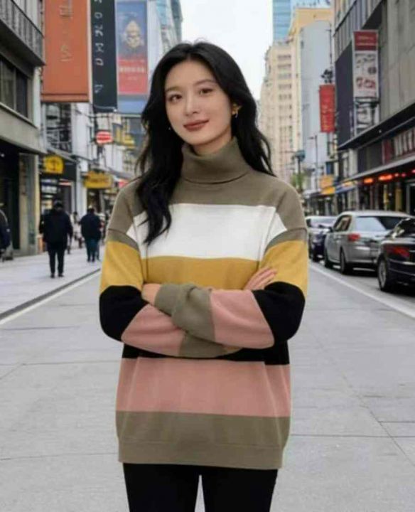捡漏款,秋冬新款撞色条纹宽松大版高领北极绒套头毛衣...
