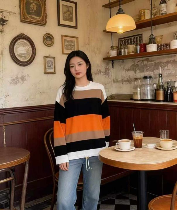捡漏款,春秋新款宽松大版撞色条纹设计款圆领包芯纱套...