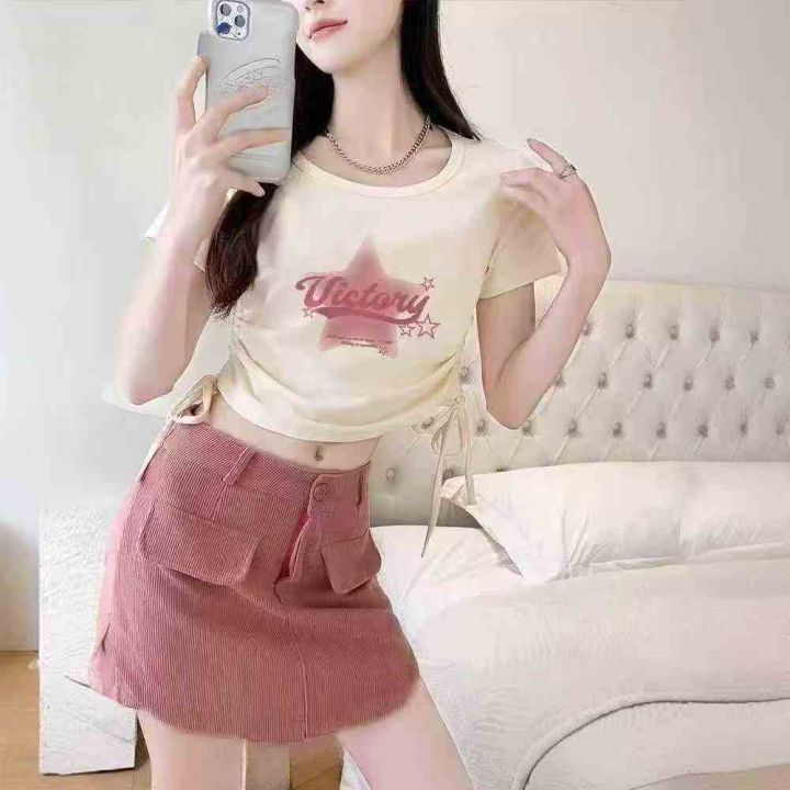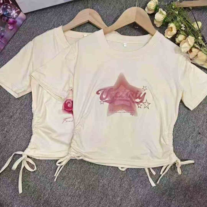 2025夏季辣妹抽绳设计百搭新款短款上衣多巴胺修身收腰短袖t恤女,整款单色两个图案,独立包装,1.3.5码,436件左右,4.9清分➕1
