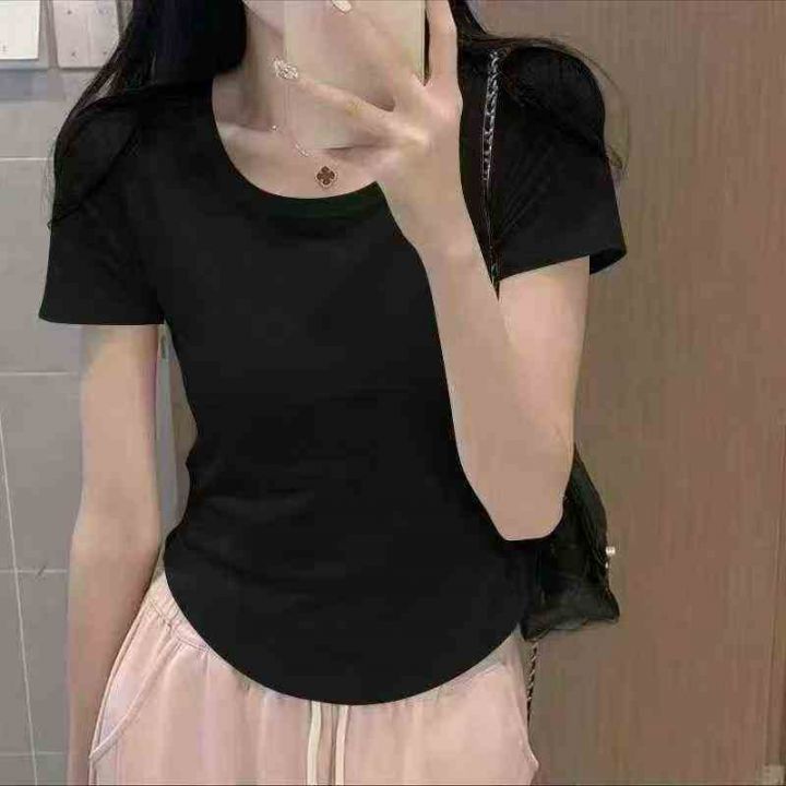 新款不规则短袖复古气质圆领修身弧形下摆螺纹T恤女,...