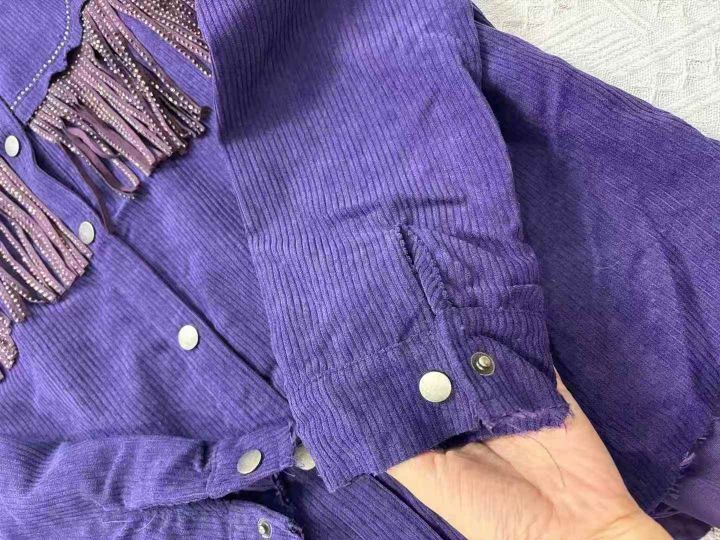 142件秋冬新款休闲紫色铆钉流苏翻领灯芯绒外套,宽松...
