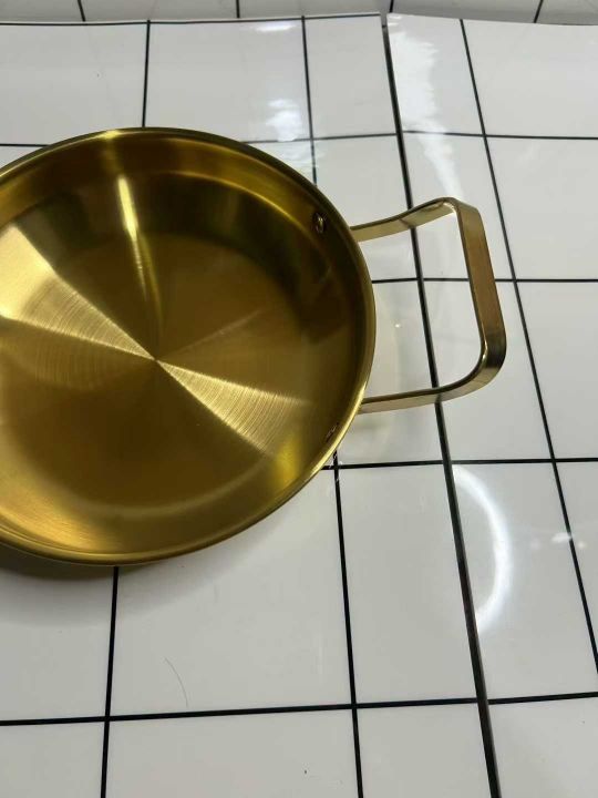 韩式不锈钢干锅海鲜锅,金色平底浅锅菜盘商用双耳锅电...