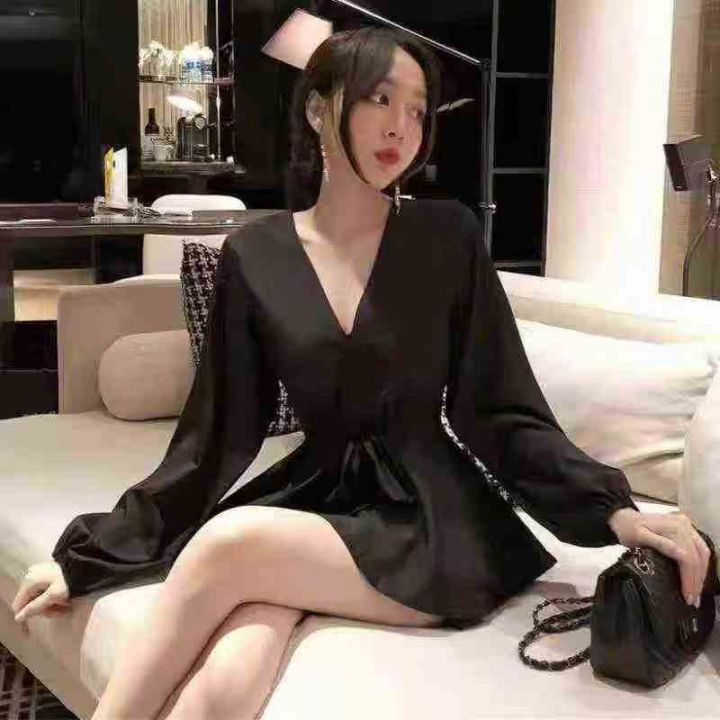 ① 春季大码女装名媛气质V领系带连衣裙!独立包装,码...