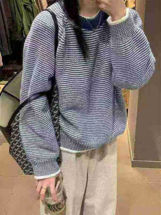 秋冬新款韩系复古蓝白条纹宽松慵懒风休闲加厚圆领套头...