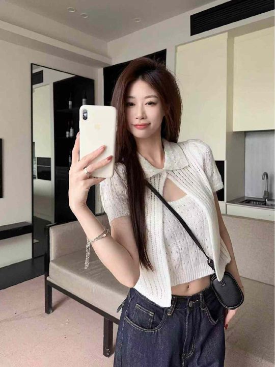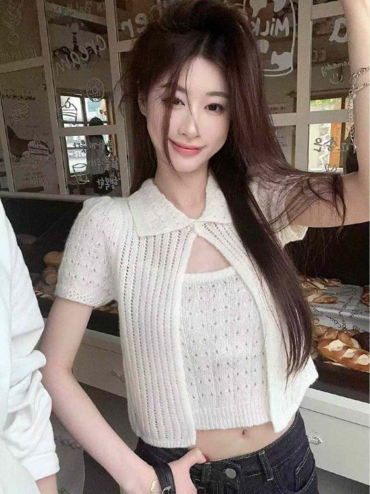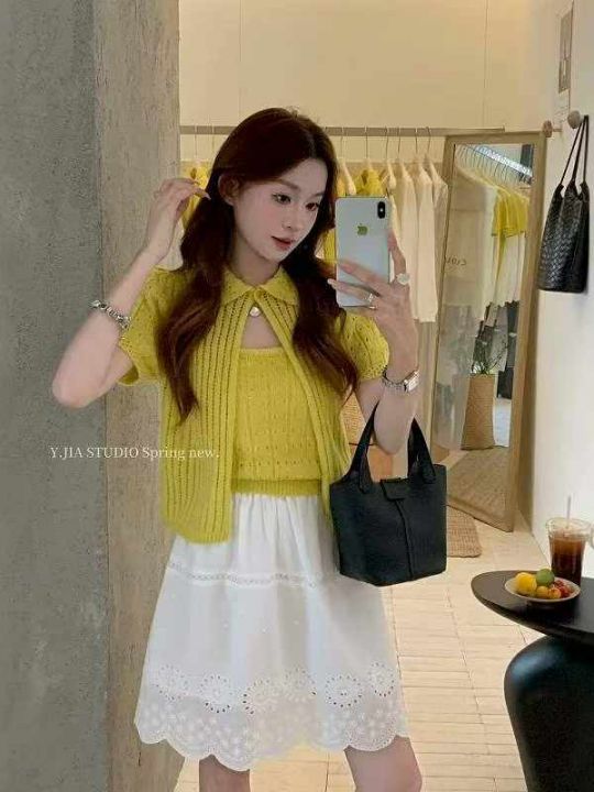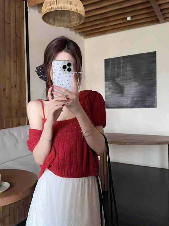 夏季新款时尚简约针织吊带+针织短袖开衫上衣两件套装...