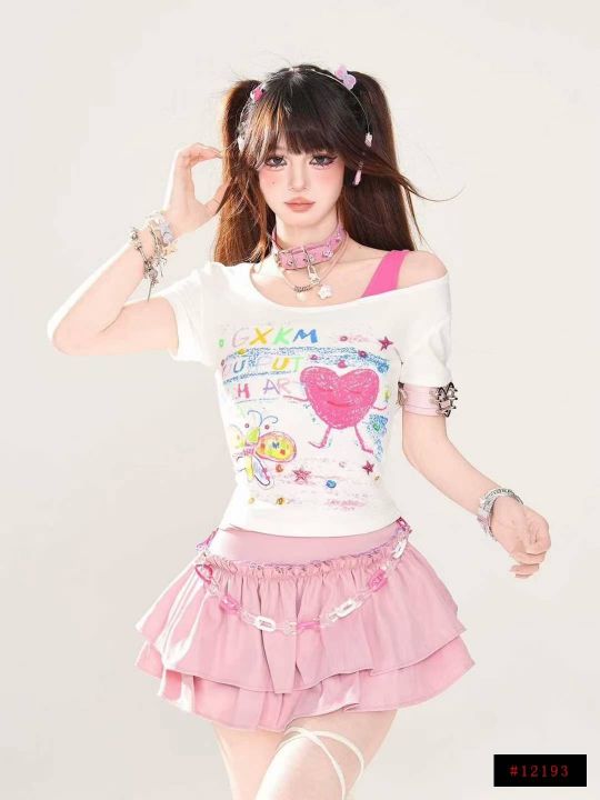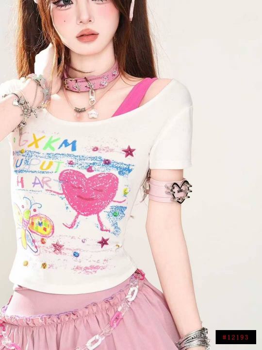 [月亮]:夏季新款涂鸦印花露肩设计纯棉辣妹上衣