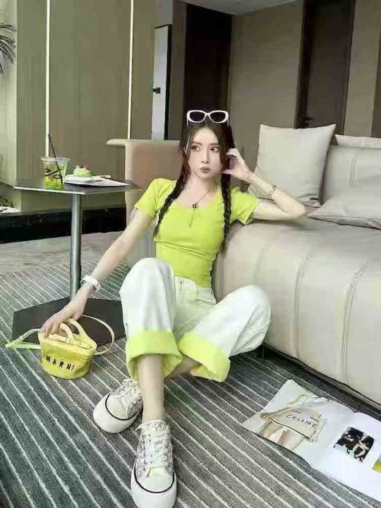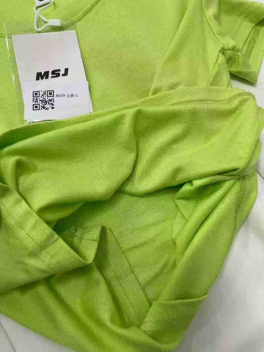 夏季新款纯欲风绿色修身U领短袖休闲裤两件套