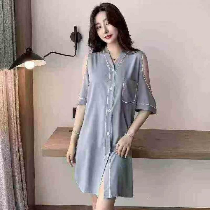 ① 网红冰丝性感露肩韩版宽松家居睡裙!独立包装,整...