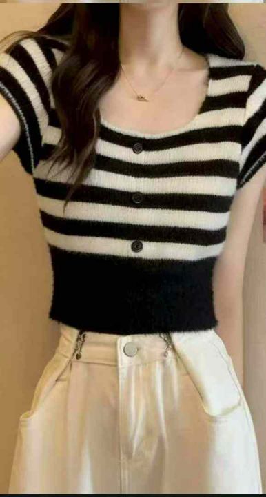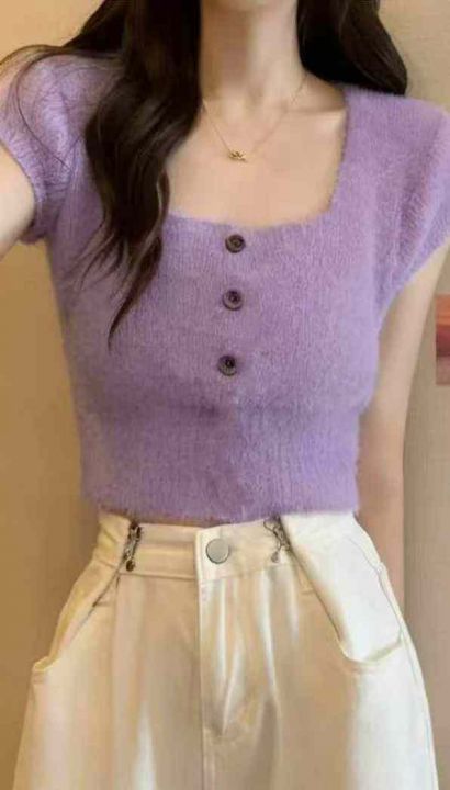 春夏季新款水貂绒高腰短款短袖方领洋气纯欲辣妹针织短袖,独立包装,均码面料软糯舒适有弹力,688件,全清6.9元超低价秒杀!分货加一!
