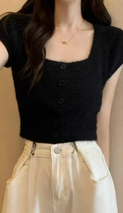 春夏季新款水貂绒高腰短款短袖方领洋气纯欲辣妹针织短袖,独立包装,均码面...