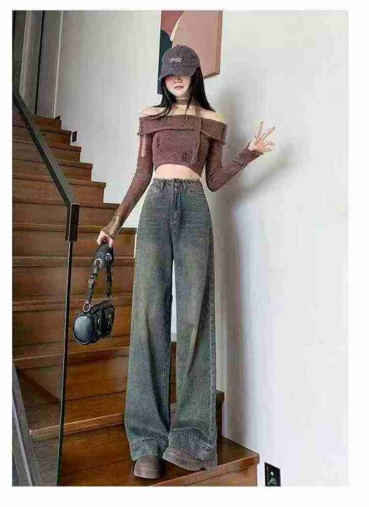 美式复古水泥灰直筒牛仔裤女高腰宽松垂感阔腿裤子,单...