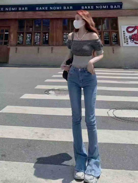 弹力蓝色马蹄女士喇叭显瘦修身拖地牛仔裤,单款单色,...