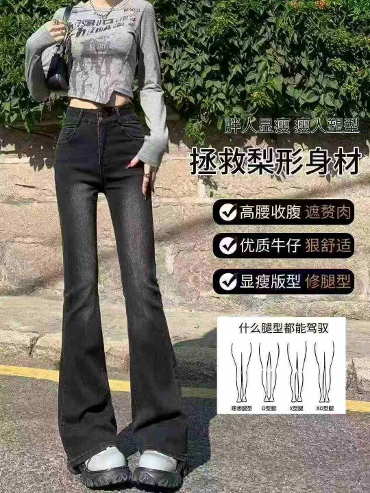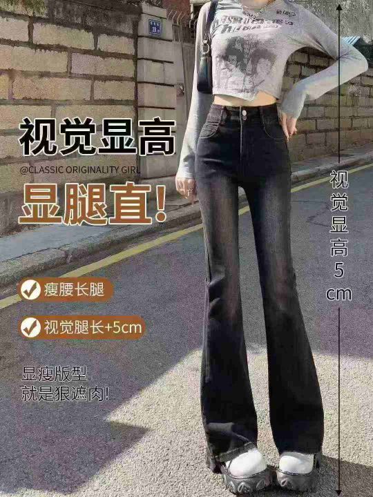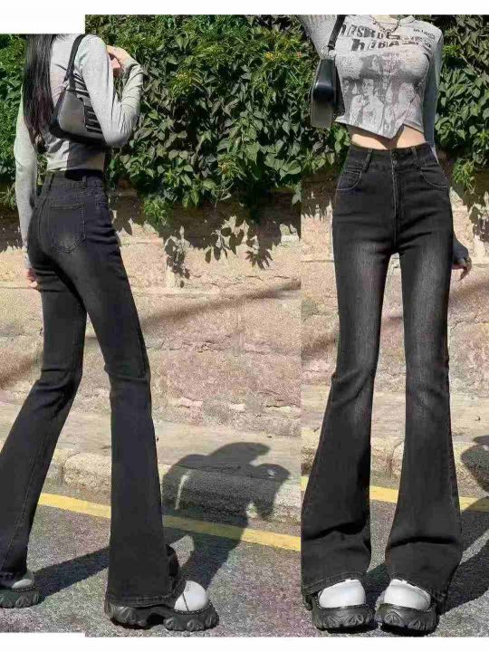 黑灰色高腰微喇女士显瘦辣妹修身弹力马蹄牛仔裤,单款...