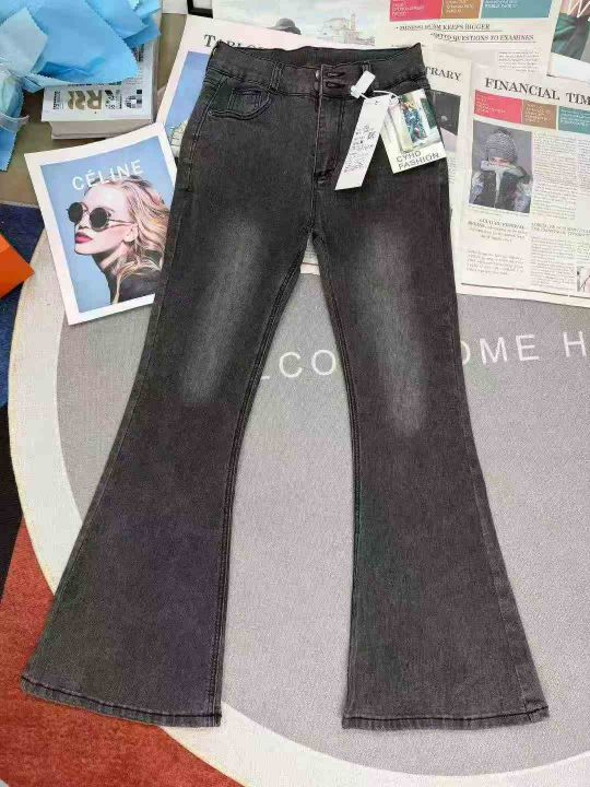 黑灰色高腰微喇女士显瘦辣妹修身弹力马蹄牛仔裤,单款...