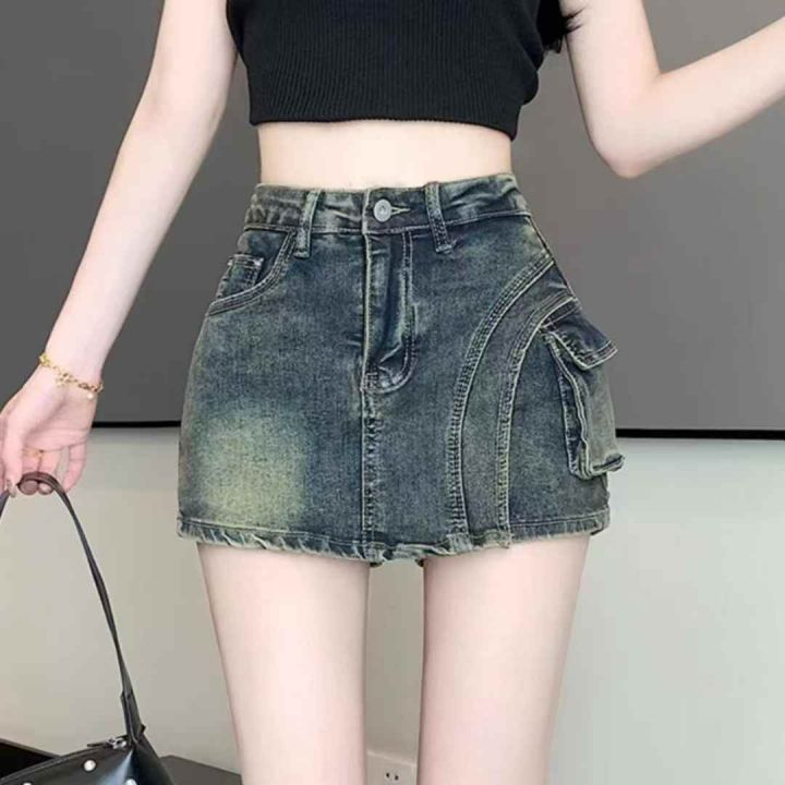 春夏新款辣妹高腰显瘦工装口袋做旧设计复古牛仔裙裤包...
