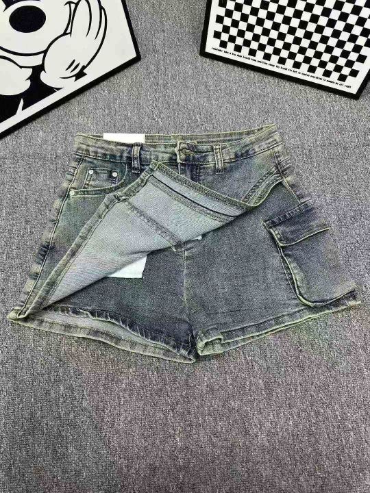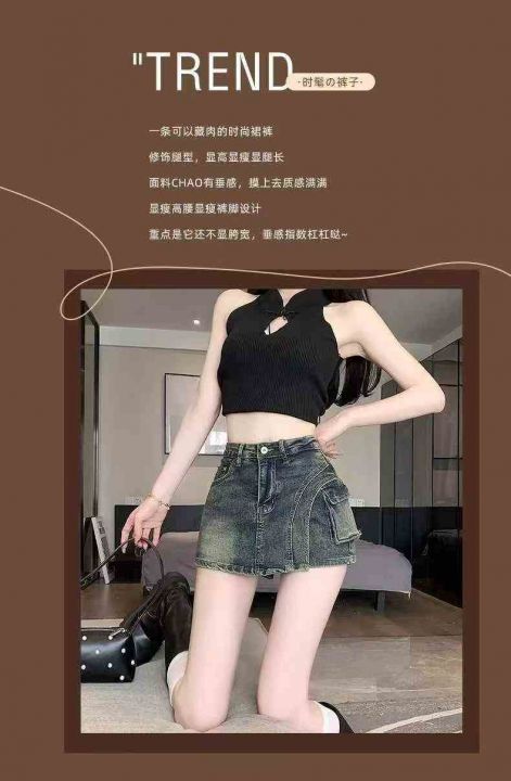 春夏新款辣妹高腰显瘦工装口袋做旧设计复古牛仔裙裤包...