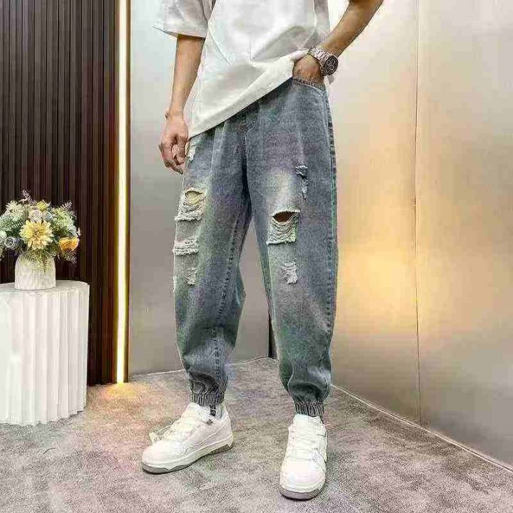 男士破洞牛仔裤2025新款宽松束脚百搭哈伦潮裤100件,...