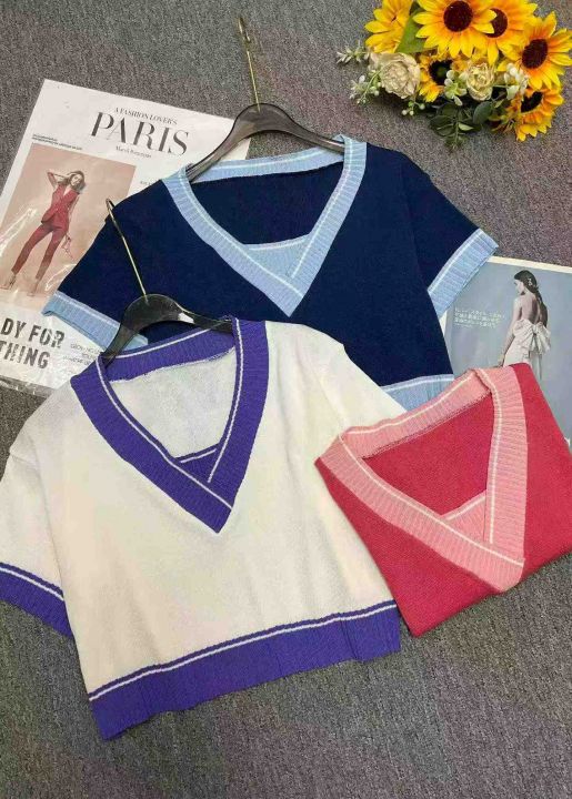 夏季新款港味风假两件V领短款宽松针织短袖T桖,独立包装,均码面料柔软舒适,530件,全清6.9元超低价秒杀!分货加一!