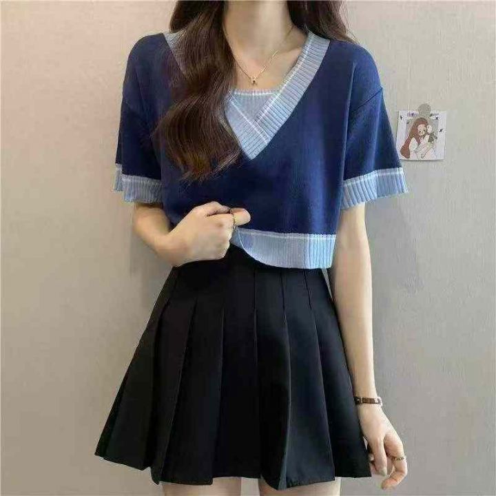 夏季新款港味风假两件V领短款宽松针织短袖T桖,独立包...