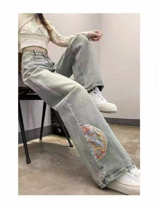 秋季新款洗水棉网红复古国风刺绣直筒阔腿牛仔长裤,独...