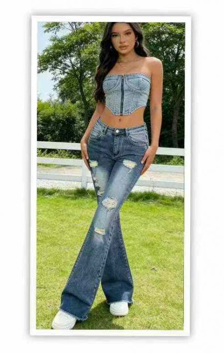 春夏季新款品牌外贸原单美式宽松高弹力洗水棉破洞牛仔微喇叭裤,独立包装,...